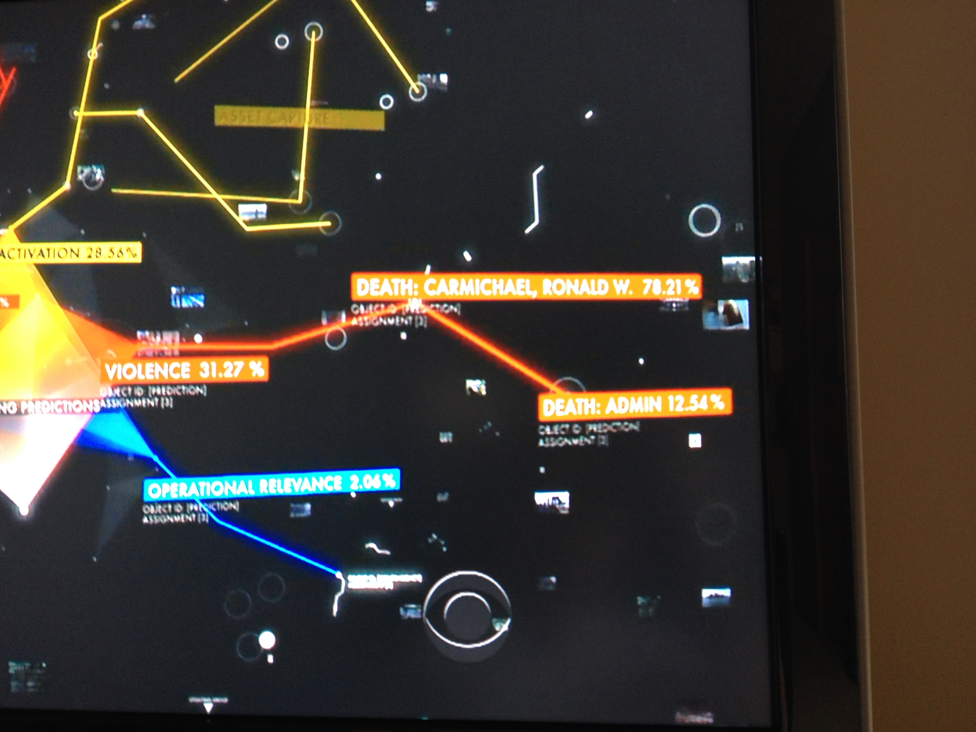The predictions begin to branch out. Notice how they maintain the color coding system. Red for violence, yellow for assets. Blue is labeled “OPERATIONAL RELEVANCE.” Blue boxes are for government agents pursuing numbers, so this could mean The Machine predicts an outcome where Root will cross paths with someone pursuing The Machine’s true purpose. Note that the percentages have changed. Violence is now more likely, Dr. Carmichael is in serious danger, an administrator may die and asset activation has edged up slightly.