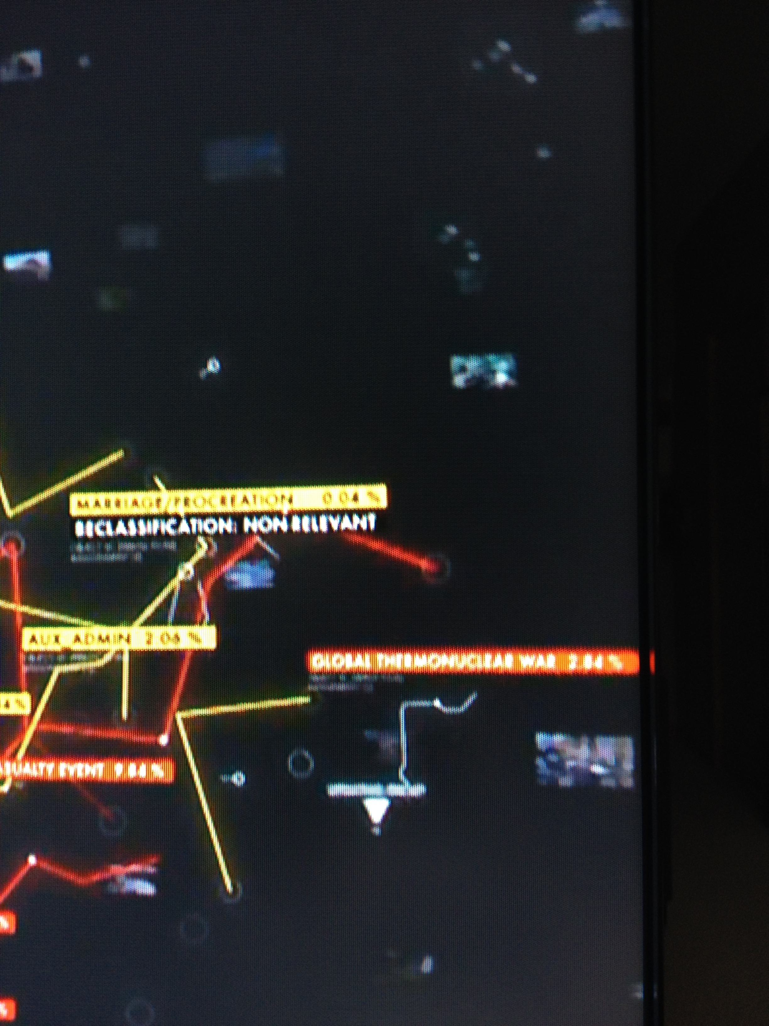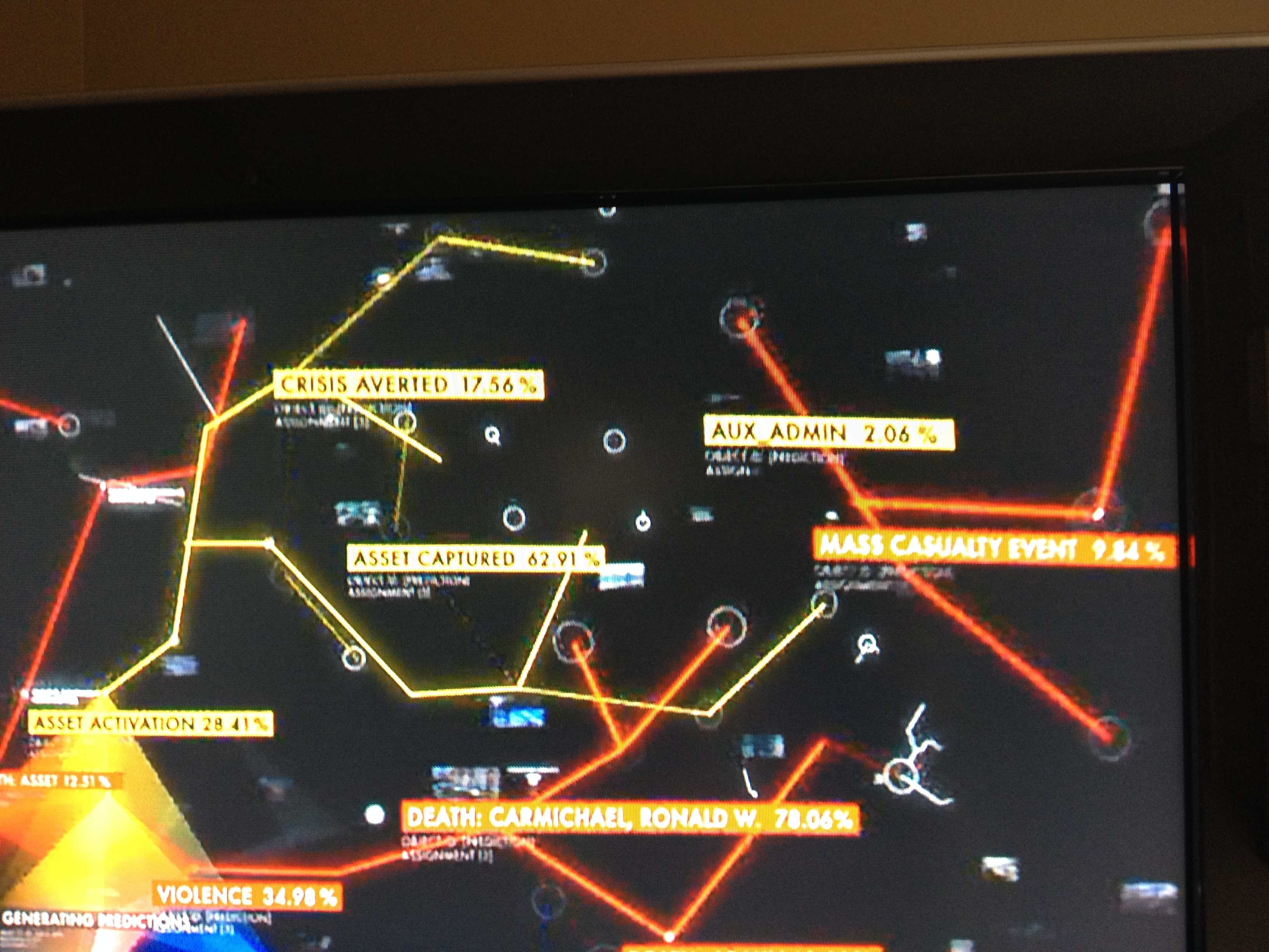 The predictions really begin to sprout. Dr. Carmichael is marginally more likely to survive and a mass casualty event is now predicted at 9.54 percent. Look at all the yellow predictions. Almost 63 percent odds that the asset gets captured, 17.56 percent the crisis is averted and 2 percent for something called Aux Admin. Notice, too, the probability of violence eeks upward.