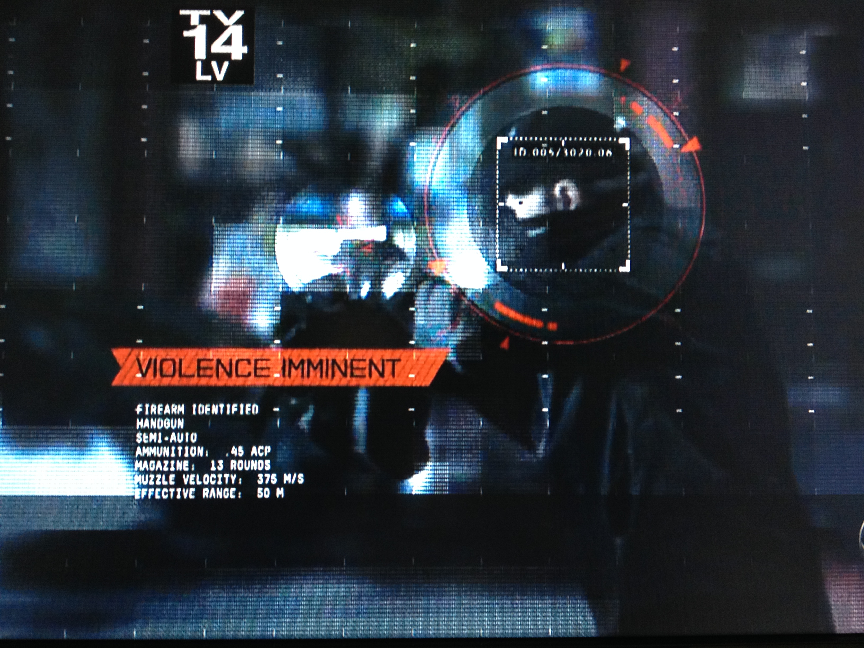 Being able to access so much information in its databases allows The Machine to identify the type of gun this threat is holding (it is hard to see the red triangles around the weapon). Like Reese’s camera, The Machine reads all kinds of information about the gun.
