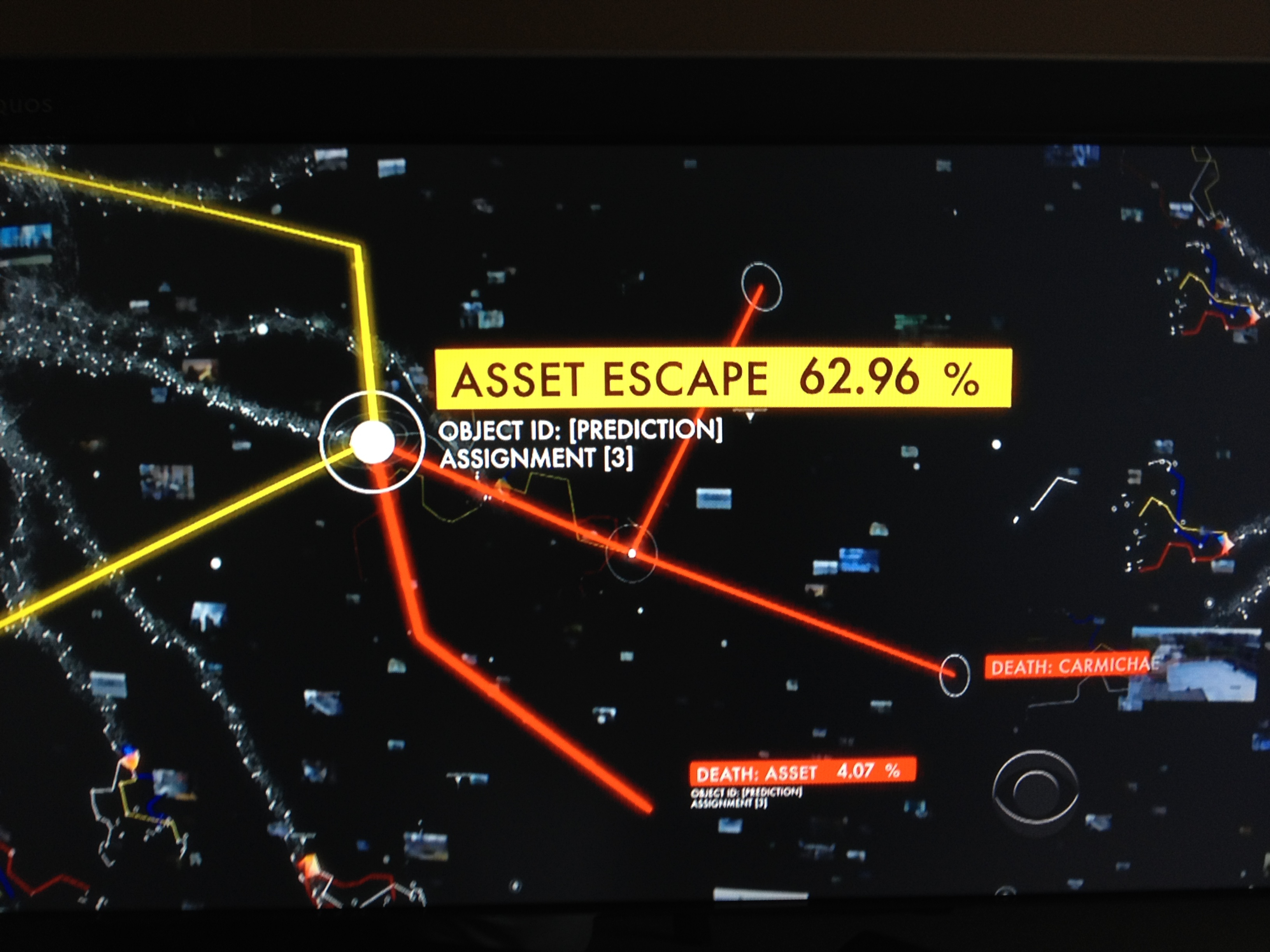 This is the shot that prompted me to do this post. I don’t recall the show ever giving us a look at exactly how The Machine goes about determining potential outcomes and their probabilities. It is The Machine on all cylinders, tapping into all of its databases and its vast amount of predictive ability.