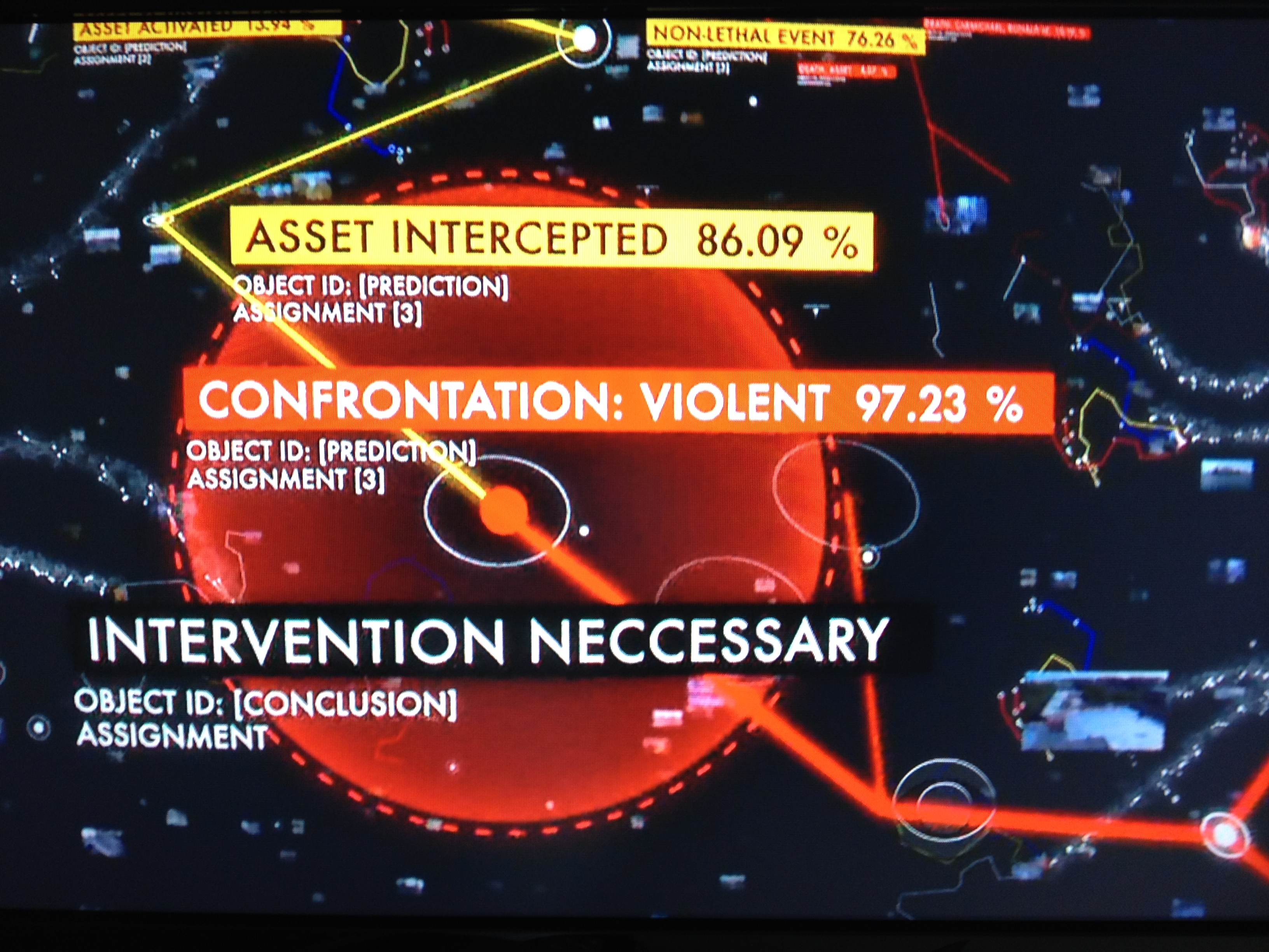 This is big. The Machine predicted a 97.23 percent chance of violence and determined an intervention is necessary. It then found Harold near a pay phone and alerted him. Look at all the lines connecting to various bits of information The Machine relied on for its predictions!
