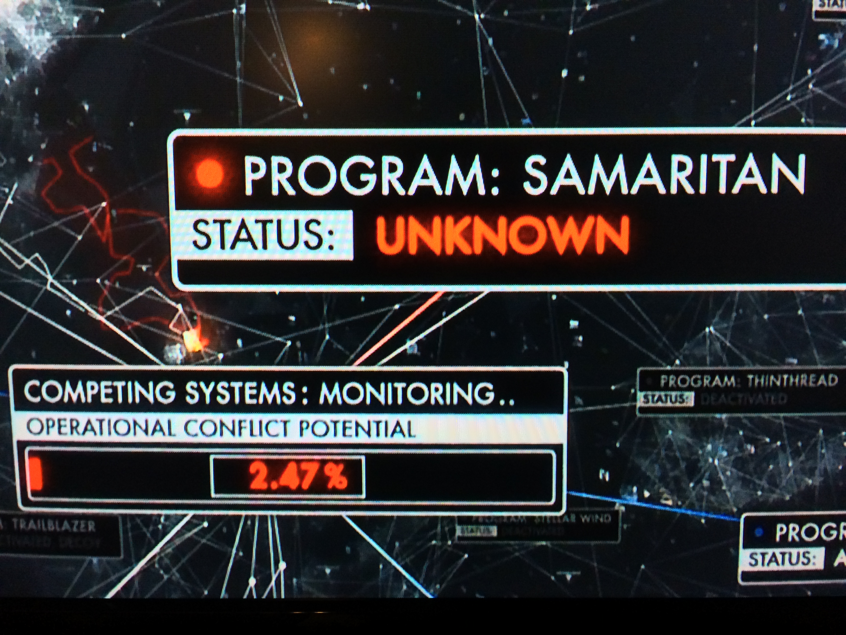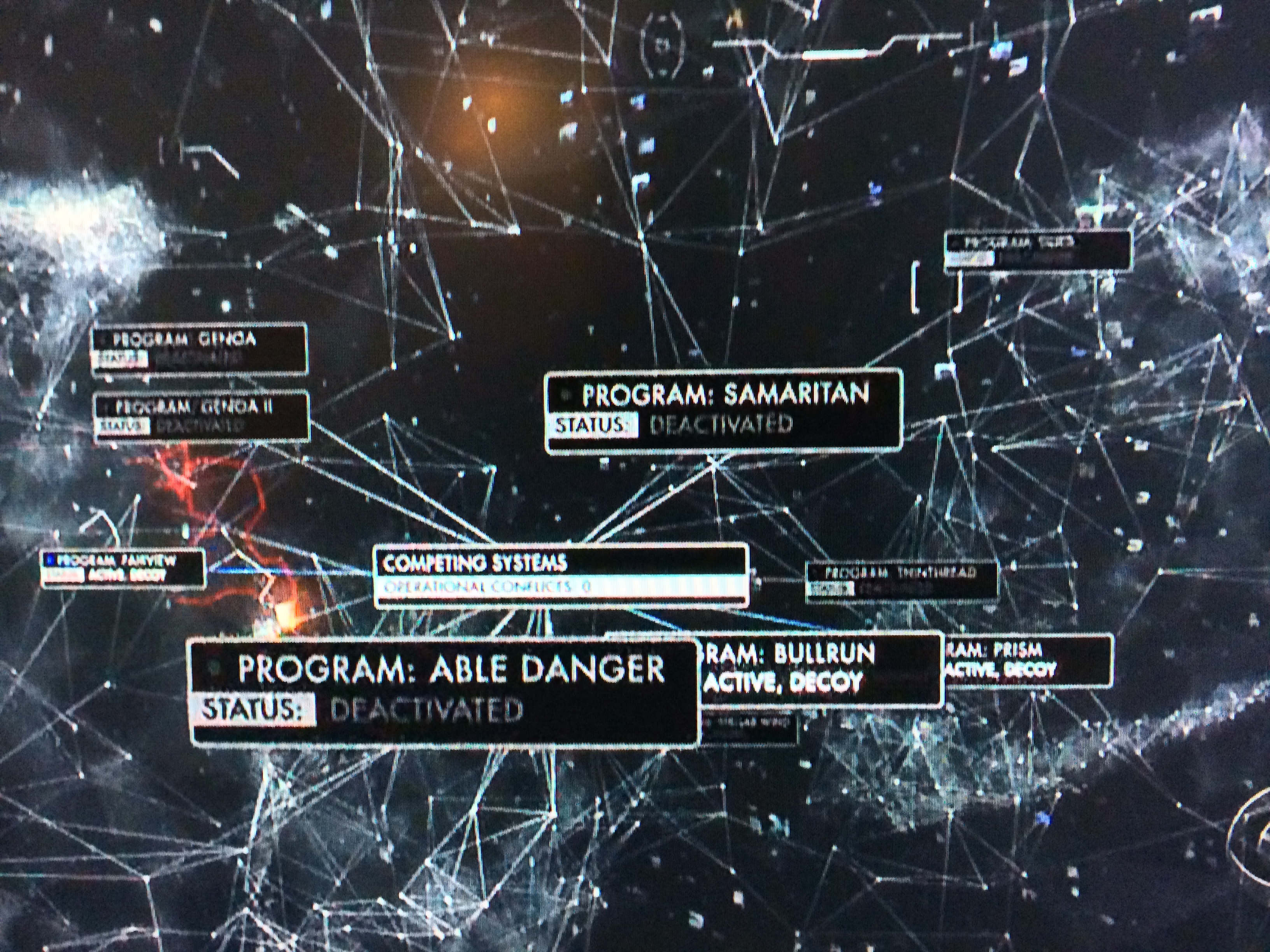 The Machine scans its database of alternate machines, some active, some not. Note Samaritan is labeled DEACTIVATED.The Machine changes Samaritan’s status to unknown and considers the potential for system conflict.